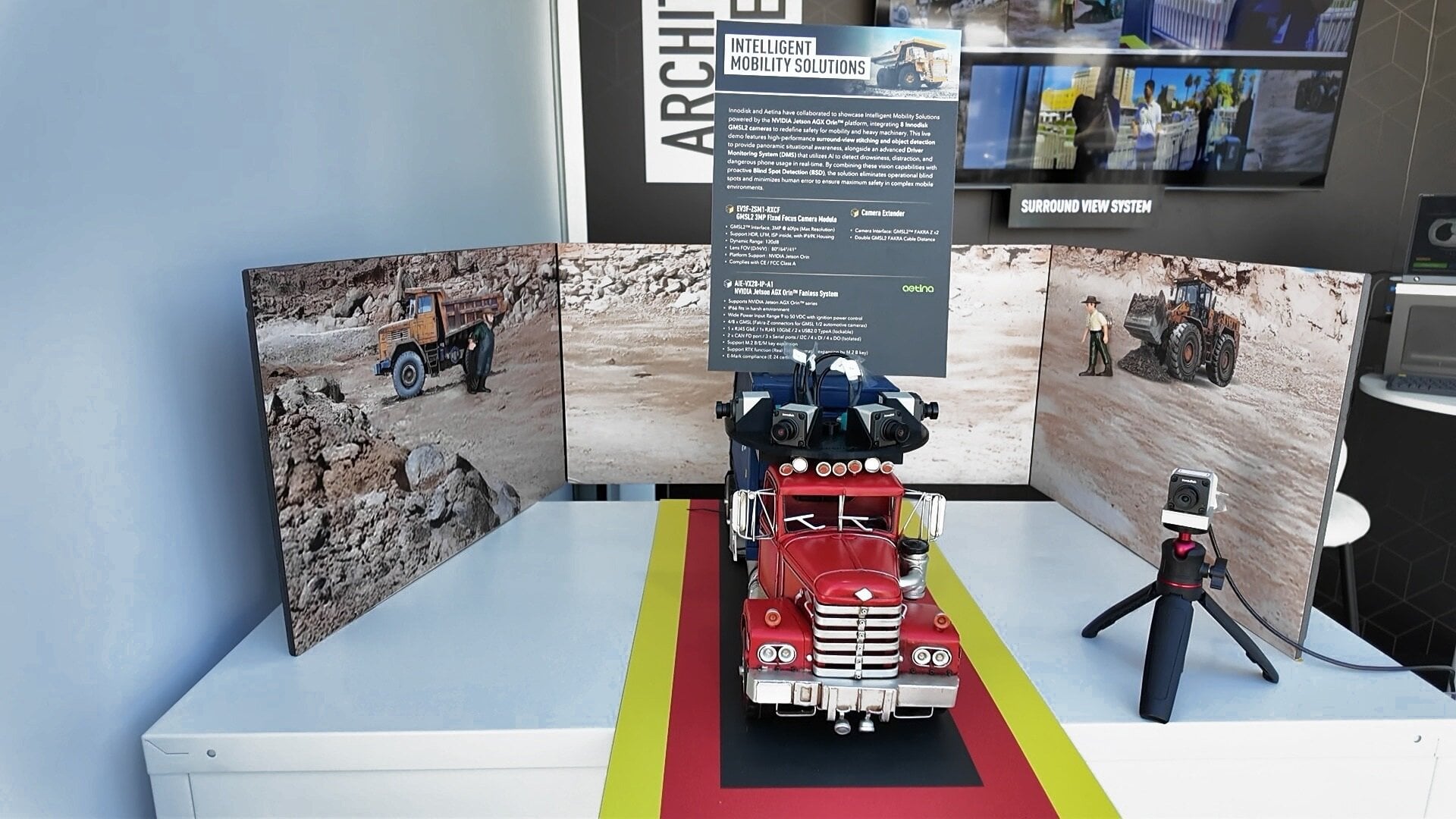 Innodisk and Aetina have jointly developed an Intelligent Mobility Solution powered by NVIDIA Jetson AGX Orin platform. By leveraging Innodisk’s custom capture card, the team integrated eight GMSL2 camera modules on a single platform, overcoming hardware integration challenges to deliver real-time multi-channel video. The solution features Surround-View Stitching and active Blind Spot Detection (BSD), while an integrated AI Driver Monitoring System (DMS) alerts against fatigue, distraction, and mobile phone use, delivering comprehensive safety coverage for heavy-duty vehicle operations.